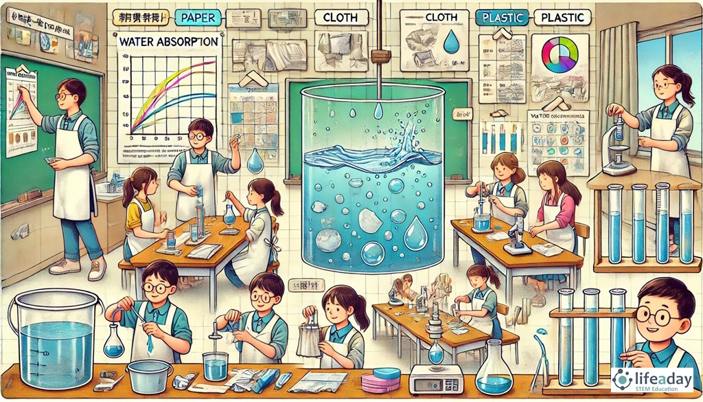 นักเรียนได้รับมอบหมายให้ทำการทดลองเพื่อศึกษาการดูดซับน้ำของวัสดุต่าง ๆ เช่น กระดาษ ผ้า และพลาสติก นักเรียนจะต้องทำการวิจัย ออกแบบการทดลอง สร้างการทดลอง และทดสอบการดูดซับน้ำของวัสดุแต่ละชนิด