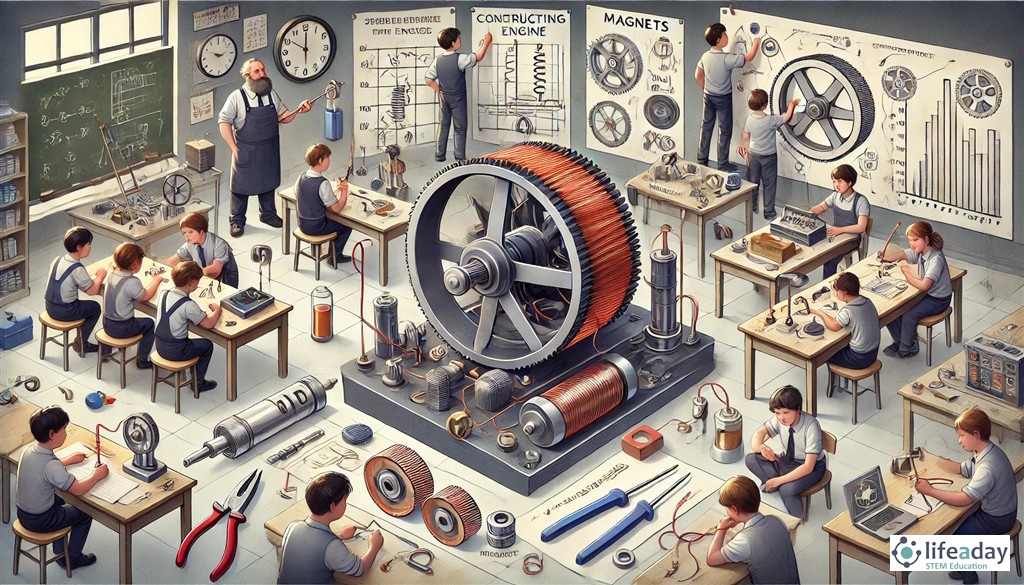 นักเรียนได้รับมอบหมายให้สร้างเครื่องยนต์แบบง่าย ๆ โดยใช้แบตเตอรี่และแม่เหล็ก นักเรียนจะต้องทำการวิจัย ออกแบบ สร้าง และทดสอบการทำงานของเครื่องยนต์นี้