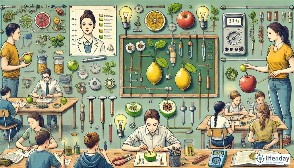 นักเรียนได้รับมอบหมายให้ทดลองสร้างพลังงานไฟฟ้าจากผลไม้ โดยใช้ผลไม้ต่างๆ เช่น มะนาว มันฝรั่ง หรือส้ม เพื่อสร้างพลังงานไฟฟ้าที่สามารถจุดหลอดไฟขนาดเล็กได้ นักเรียนจะต้องทำการวิจัย ออกแบบการทดลอง สร้างการทดลอง และทดสอบการสร้างพลังงานไฟฟ้าจากผลไม้