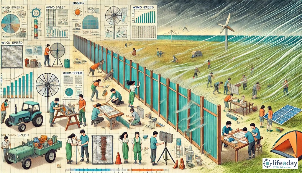 นักเรียนได้รับมอบหมายให้ศึกษาและออกแบบแผ่นกันลมสำหรับพื้นที่ที่มีลมแรง เพื่อป้องกันการเสียหายของพืชหรือสิ่งก่อสร้าง นักเรียนจะต้องทำการวิจัย ออกแบบ สร้าง และทดสอบประสิทธิภาพของแผ่นกันลม