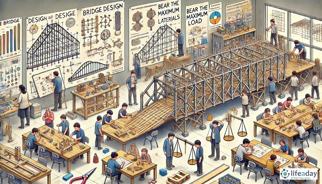 นักเรียนได้รับมอบหมายให้ออกแบบโมเดลสะพานที่สามารถรับน้ำหนักได้มากที่สุดโดยใช้วัสดุจำกัด นักเรียนจะต้องทำการวิจัย ออกแบบโครงสร้าง สร้างโมเดล และทดสอบความสามารถในการรับน้ำหนักของโมเดลสะพาน